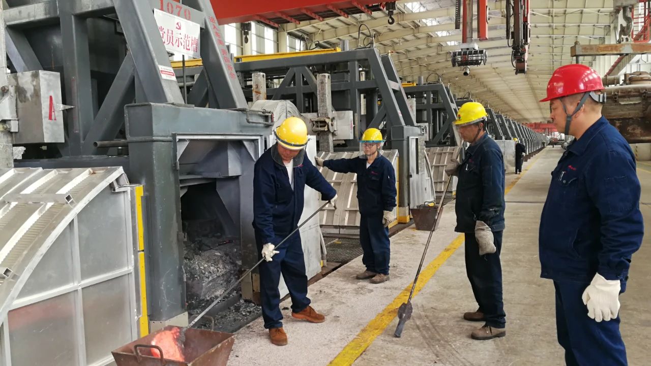 據悉,為確保二工段116臺電解槽安全高效快速啟動,廣元中孚項目部統籌協調、全面動員,要求每名管理人員深入基層,分包責任槽,傾盡所能為一線員工提供幫助。在啟動現場,記者看到,全體黨員干部把鮮艷的紅旗插到電解槽旁,與一線員工融為一體,不懼艱難,沖鋒陷陣,強力推進投產進程?,F場干部員工一起裝爐、封料、撈碳渣、調參數,每項操作都扎扎實實、一絲不茍。他們身上的工作服被汗水浸透,白皙的臉龐被熱氣烤得通紅,但他們全然不顧,依然忘我地忙碌著。沸騰的電解質在槽內上下翻滾,火眼內不時噴發出強勁有力的藍色火苗,無不昭示著企業美好的發展前景。