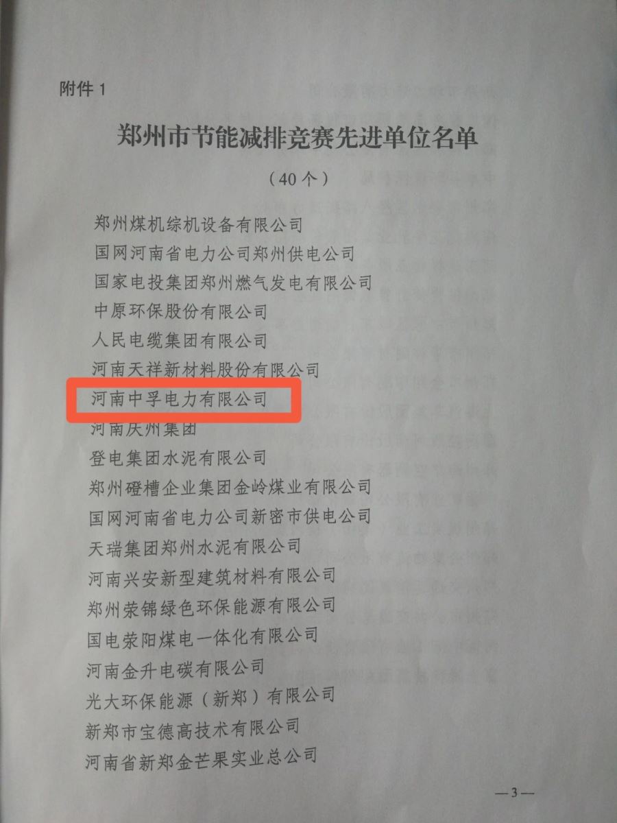 中孚電力公司被評為“鄭州市節能減排競賽先進單位”