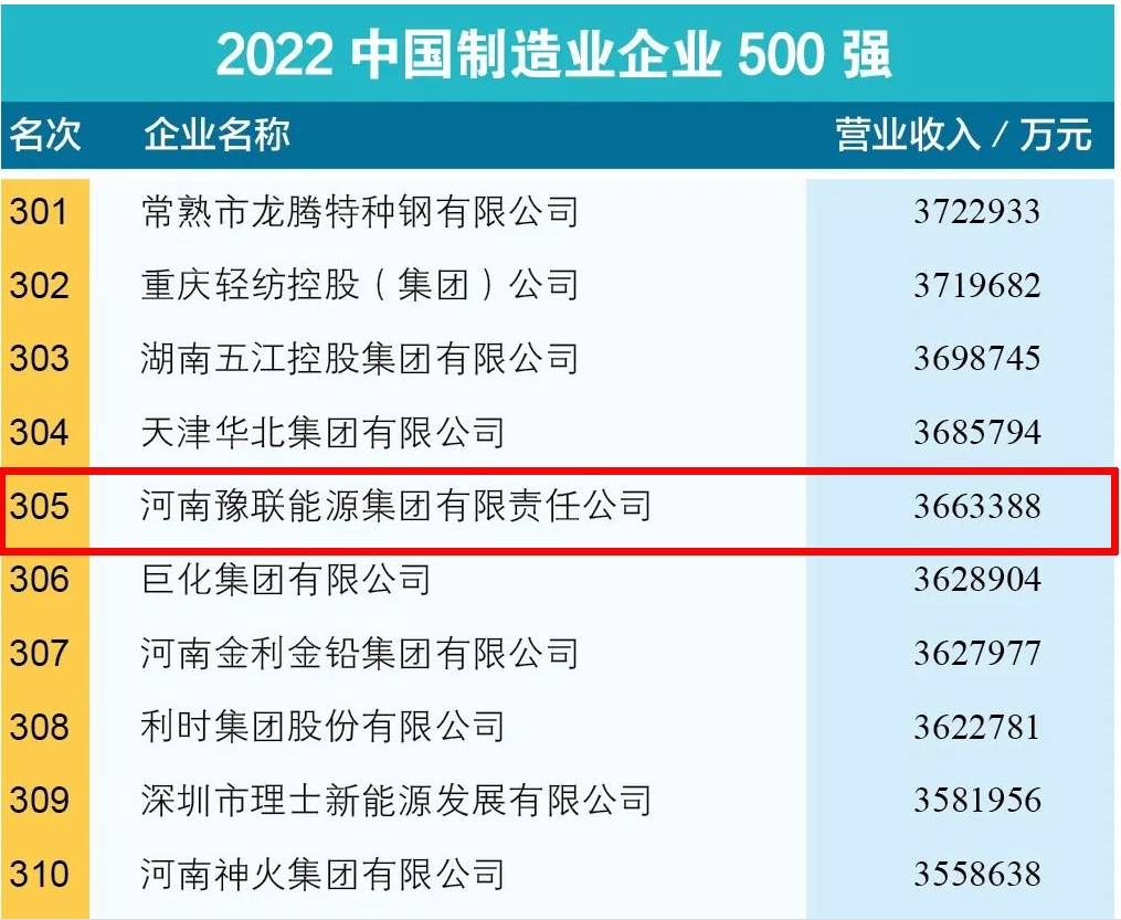 豫聯集團上榜“2022中國制造業企業500強”