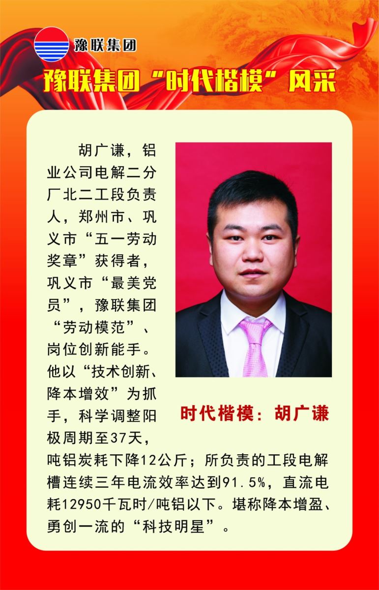 他,是鄭州市、鞏義市“五一勞動獎?wù)?rdquo;獲得者,他,是鞏義市最美黨員,豫聯(lián)集團“時代楷模”、青年崗位能手......他,開發(fā)了“3N”鋁特區(qū)、研發(fā)了攻克低鐵槽的技術(shù)......他,叫胡廣謙,中孚鋁業(yè)公司電解二分廠北二工段負責人,2006年進入公司工作,扎根電解生產(chǎn)一線,勤學苦練,潛心鉆研,降本增效,勇創(chuàng)一流。