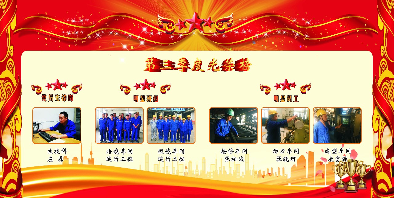 為展示優(yōu)秀員工風(fēng)采,形成人人創(chuàng)優(yōu)、個個爭先的良好氛圍,近日,中孚炭素公司開展第三季度總結(jié)評比工作。經(jīng)各車間推薦及公司評比,焙燒車間運(yùn)行三班、煅燒車間運(yùn)行二班榮獲“明星班組”稱號,張松波、張曉珂、康富強(qiáng)榮獲“明星員工”稱號,左磊榮獲“黨員先鋒崗”稱號。