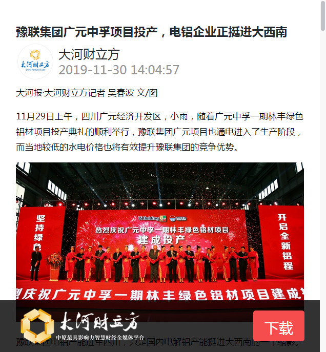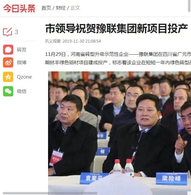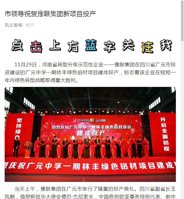 連日來,豫聯集團廣元中孚一期林豐綠色鋁材項目建成投產的消息被中華人民共和國中央人民政府網、新華社、新華網、人民網、中國證券網、中國有色金屬報、河南日報、鞏義市人民政府網等眾多主流媒體廣泛宣傳、轉載報道。